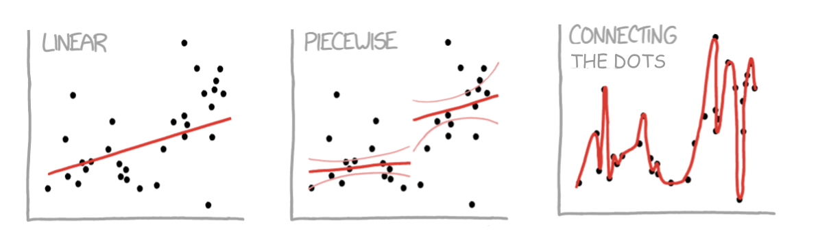 In a regression example, this would be the question of deciding between whether the data points can best be modeled with one line (by using “linear regression”, shown in panel 1 of the cartoon) or by multiple, shorter lines stuck together (by using “linear splines”, shown in panel 2 of the cartoon).