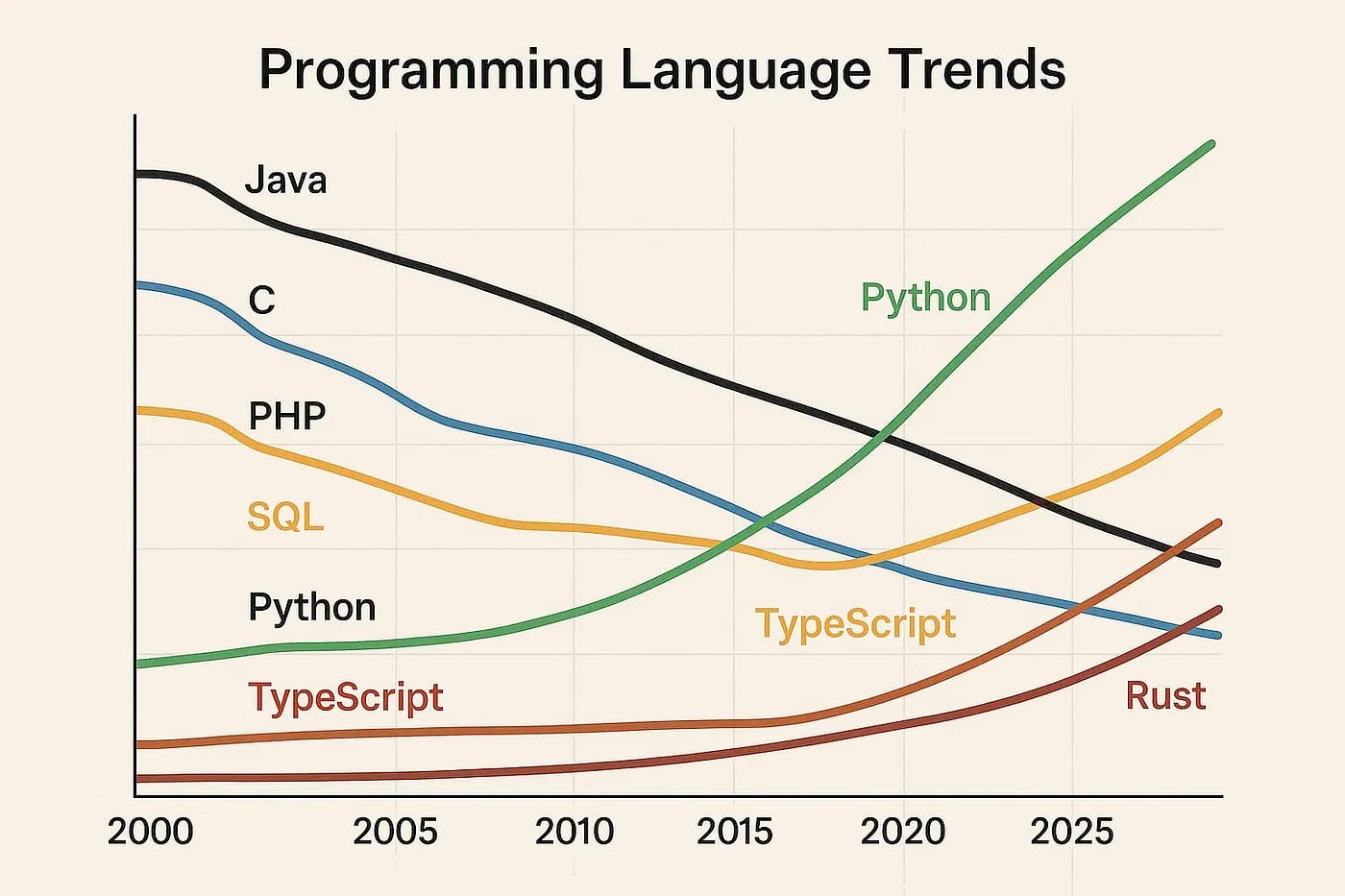 Training data for software development is of lower code quality, because of what’s publicly available! In 2023, GitHub had over 420 million repositories, with 28 million public. While that seems like a big number, let’s take a step back and think about who makes their code public? Typically, it’s individuals working on passion projects and large open-source projects, such as Apache Software Foundation. Most companies are not sharing their code publicly; that’s one of their moats. As a result, I would expect more mistakes and issues in publicly available code! And software language preferences change over time; one example is shown in the figure below from this Medium article: